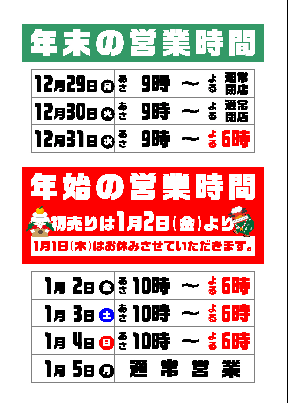 年末年始 営業時間